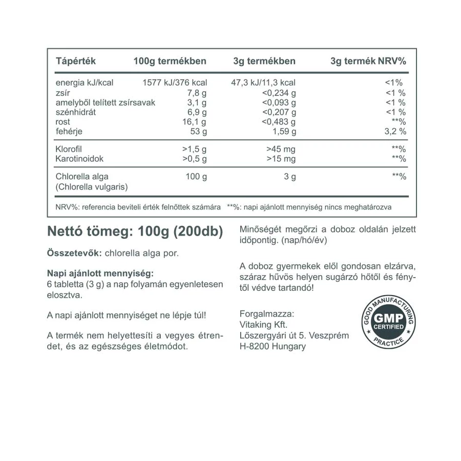 100% Chlorella! A termék nem tartalmaz semmi egyebet csak az algát. Különleges gyártástechnológiának köszönhetően semmiféle tablettagyártáshoz használt egyéb segédanyagot nem kellett használnunk. A Chlorella alga teljes értékű táplálék, mely gazdag vitaminokban, ásványi anyagokban, fehérjében, karotinoidokban, enzimekben és klorofillban. Támogatja a szervezet anyagcsere folyamatait, hozzájárul az immunrendszer megfelelő működéshez, segíti a természetes méregtelenítő folyamatotokat. A Chlorella alga rengeteg vitamint és nyomelemeket, valamint biológiailag kötött ásványi anyagokat: foszfort, káliumot, magnéziumot, kalciumot (ezek koncentrációja nagyobb, mint a többi szárazföldi növénynél).