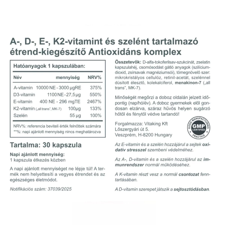 A hétköznapok során számos tényező állítja kihívás elé a szervezetünket – a feszített tempó, a kevés napfény, a városi levegő vagy a nem mindig kiegyensúlyozott étkezés. A Vitaking Antioxidáns Komplex összetevői kiváló támogatást nyújtanak a sejteknek, a mindennapi terhelések közepette. A-, D3-, E- és K2-vitamin, illetve szelén, gondosan válogatott összetevők, magas hatóanyag-tartalom.