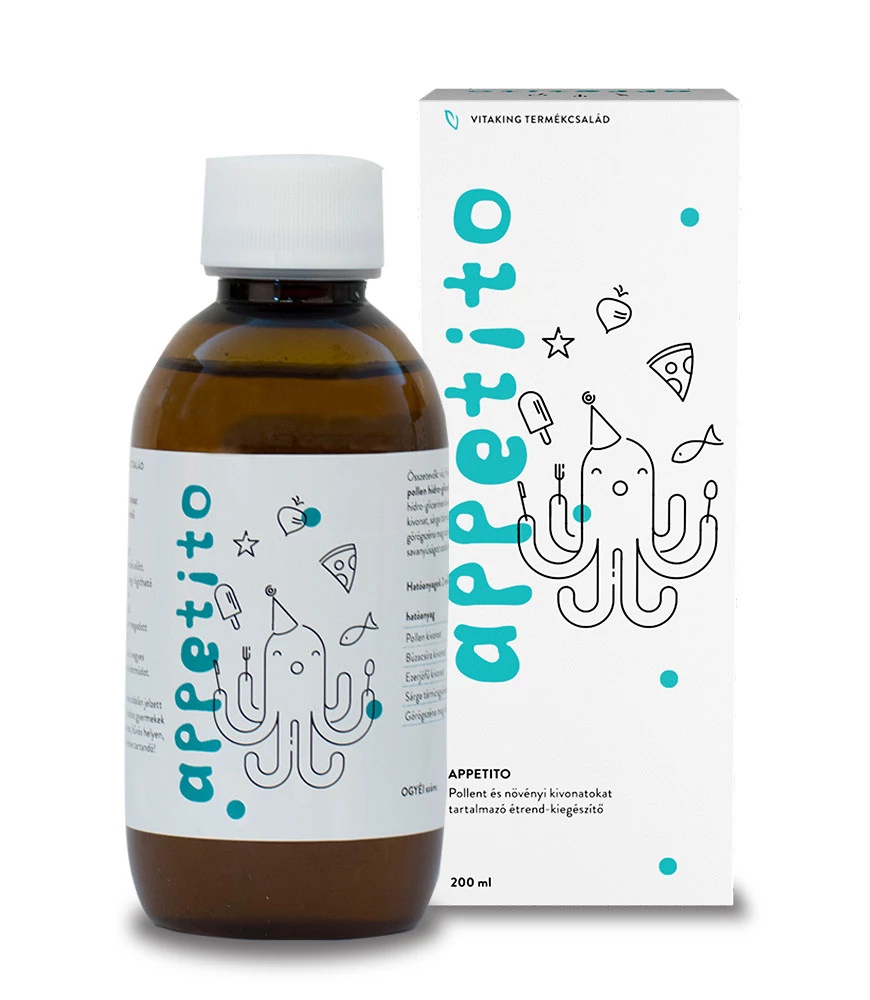 A Vitaking Appetito szirup – egy kimondottan jóízű, speciális gyógynövény összeállítás gyermekeknek az egészséges étvágyért és emésztésért. Tartalmaz pollen kivonatot, búzacsíra kivonatot ezerjófű kivonatot, sárga tárnicsgyökér kivonatot, és görögszéna mag kivonatot.
