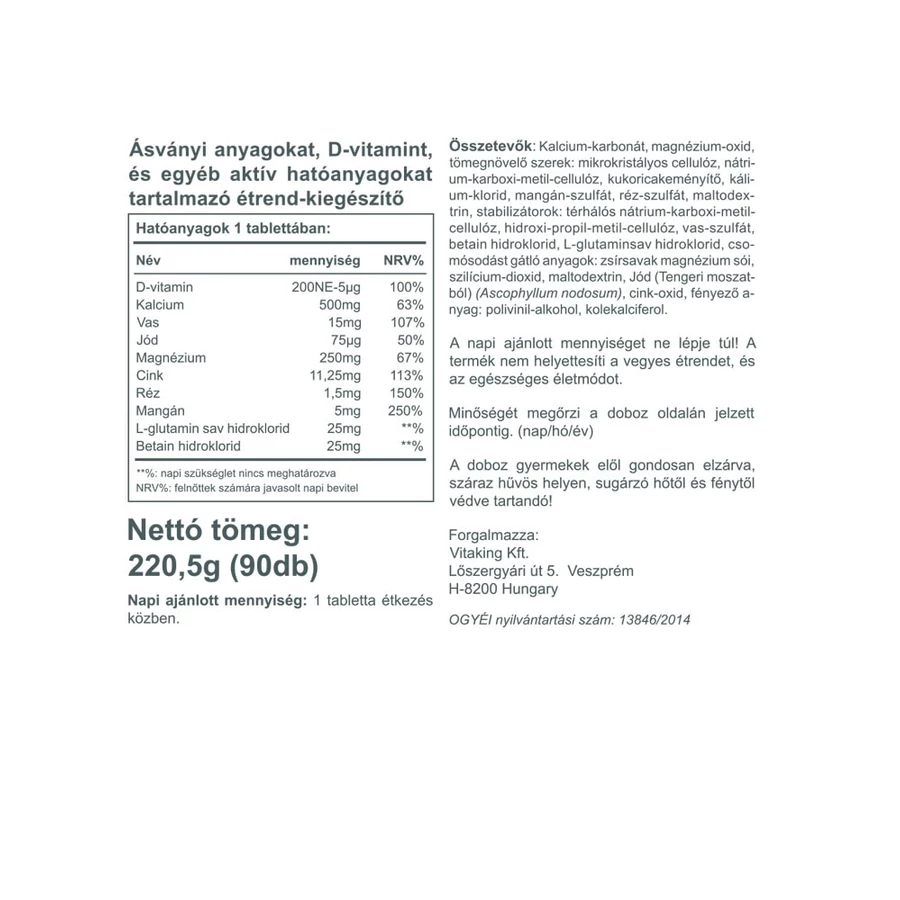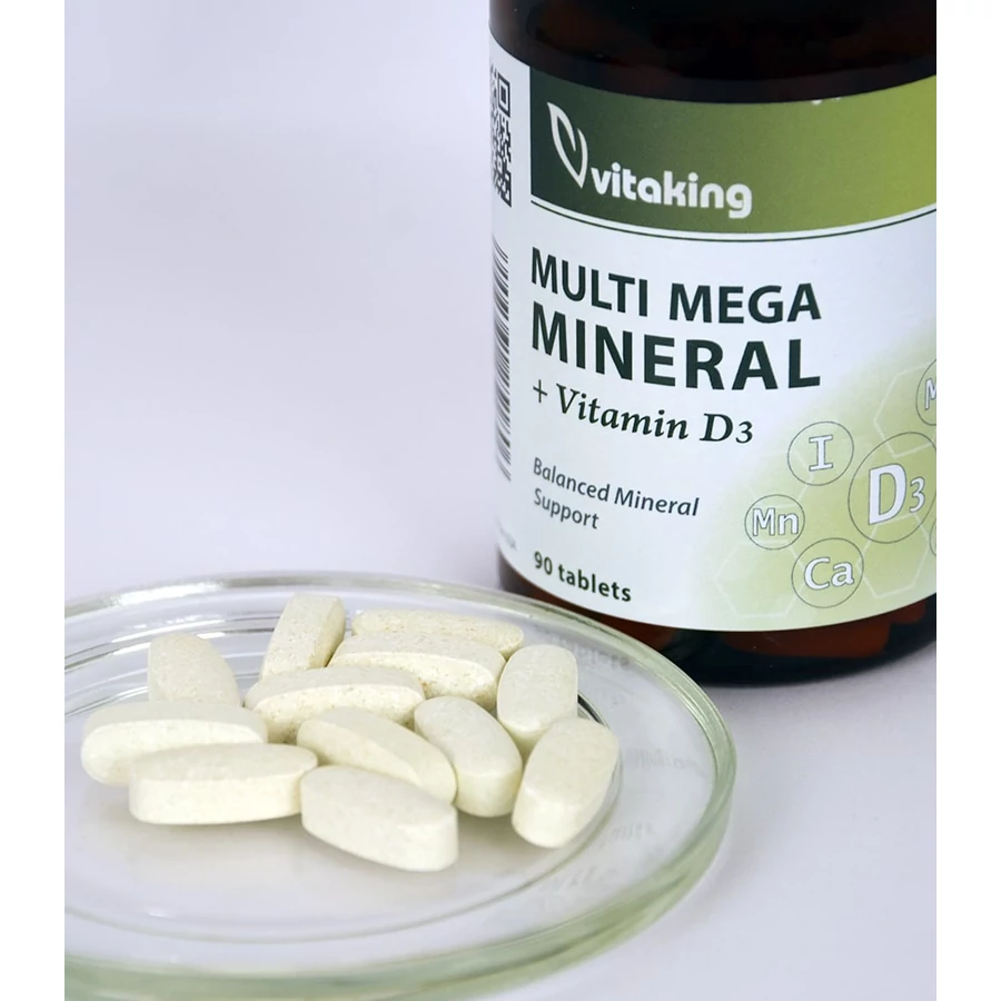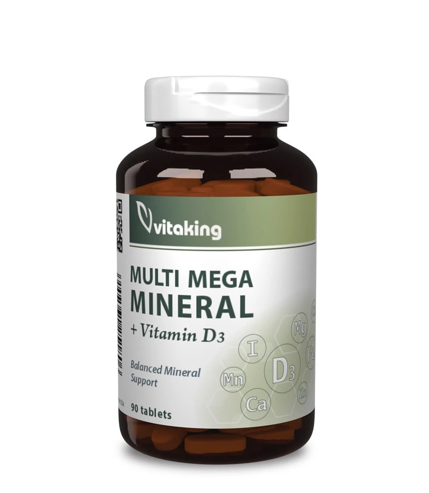 A Vitaking Multi Mega Mineral ásványi anyagokat, D-vitamint és egyéb aktív hatóanyagot tartalmazó étrend-kiegészítő. Nyomelemekből (cink, mangán, vas, réz, króm, molibdén) naponta mindössze néhány ezred vagy milliomod grammnyit használ fel a szervezetünk, ennek ellenére elengedhetetlenek egészségünk megtartásához. Ásványi anyagokból (kalcium, magnézium, kálium) nagyobb mennyiségre van szükségünk. Az ásványi anyagok és nyomelemek számos biokémiai folyamatban együttesen vesznek részt és erősítik egymás hatását.
