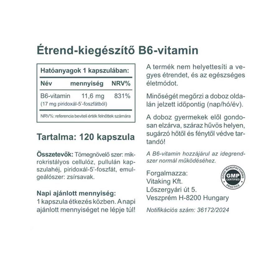 A készítmény kapszulánként 11,6 mg B6-vitamint tartalmaz (17 mg piridoxál-5’-foszfátból) így segíti a szervezet optimális támogatását a stresszes vagy megterhelő időszakokban.