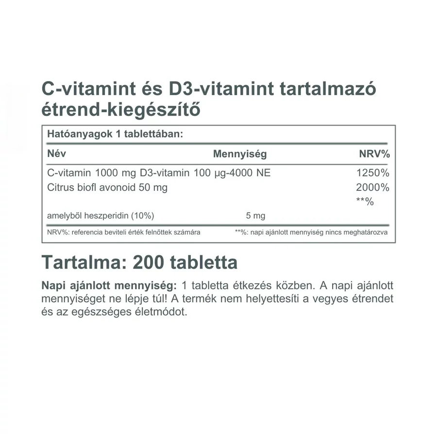 Miért vennéd meg külön külön, mikor mostantól elérhető egyben! C- és D-vitamin egy tablettában, magas hatóanyag tartalommal és extra citrus bioflavonoid kiegészítéssel! Minden egyes tabletta 1000 mg C-vitamint, 4000 NE D3 vitamint és 50 mg citrus bioflavonoidot tartalmaz.