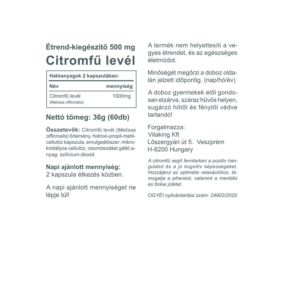 Összetevők: Citromfű levél (melissa officinalis) őrlemény, hidroxi-propil-metil-cellulóz kapszula, emulgeálószer: mikrokristályos cellulóz, csomósodást gátló anyag: szilícium-dioxid