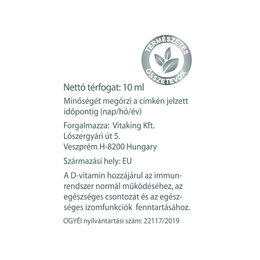 A D-vitamin (D3 vitamin) zsírban oldódik. A Vitaking D vitamin csepp már eleve olajban oldva tartalmazza a hatóanyagot. Nagyvárosokban, ahol sűrű a szmog, emelni kell a D-vitamin bevitelt. Alapvető feladata a vér kalcium- és foszforszintjének szabályozása, a csontok erősítése és az egészséges fogazat fenntartása.