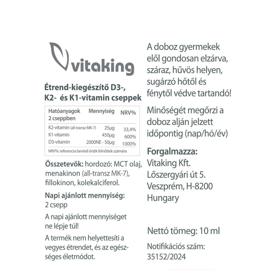 A D-vitamin (D3 vitamin) zsírban oldódik. A Vitaking D vitamin csepp már eleve olajban oldva tartalmazza a hatóanyagot. Nagyvárosokban, ahol sűrű a szmog, emelni kell a D-vitamin bevitelt. Alapvető feladata a vér kalcium- és foszforszintjének szabályozása, a csontok erősítése és az egészséges fogazat fenntartása.