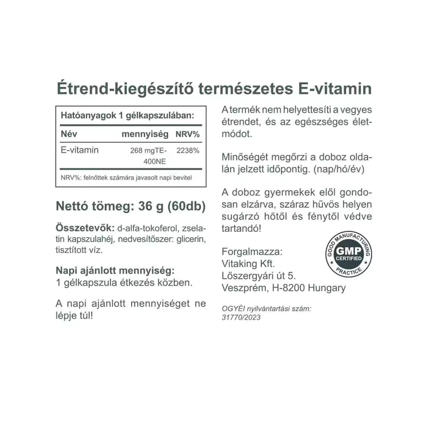 A Vitaking E-vitamin 400NE E vitamint tartalmaz. Számos kutató szerint a természetes változata (d-alpha) hatékonyabb és jobban felszívódik, mint a szintetikus (dl-alpha) változat.