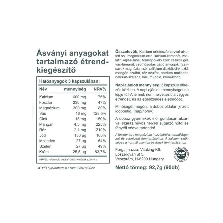 Kalcium ortofoszforsavval alkotott sói, magnézium-oxid, kalcium-karbonát, zselatin kapszulahéj, tömegnövelő szer: cellulóz gél, vas-fumarát, csomósodás gátló anyagok: (zsírsavak magnézium sói, szilícium-dioxid, cink-oxid, mangán-szulfát, réz-szulfát, nátrium-molibdát, nátrium-szelenit, kálium-jodid, és króm-klorid.