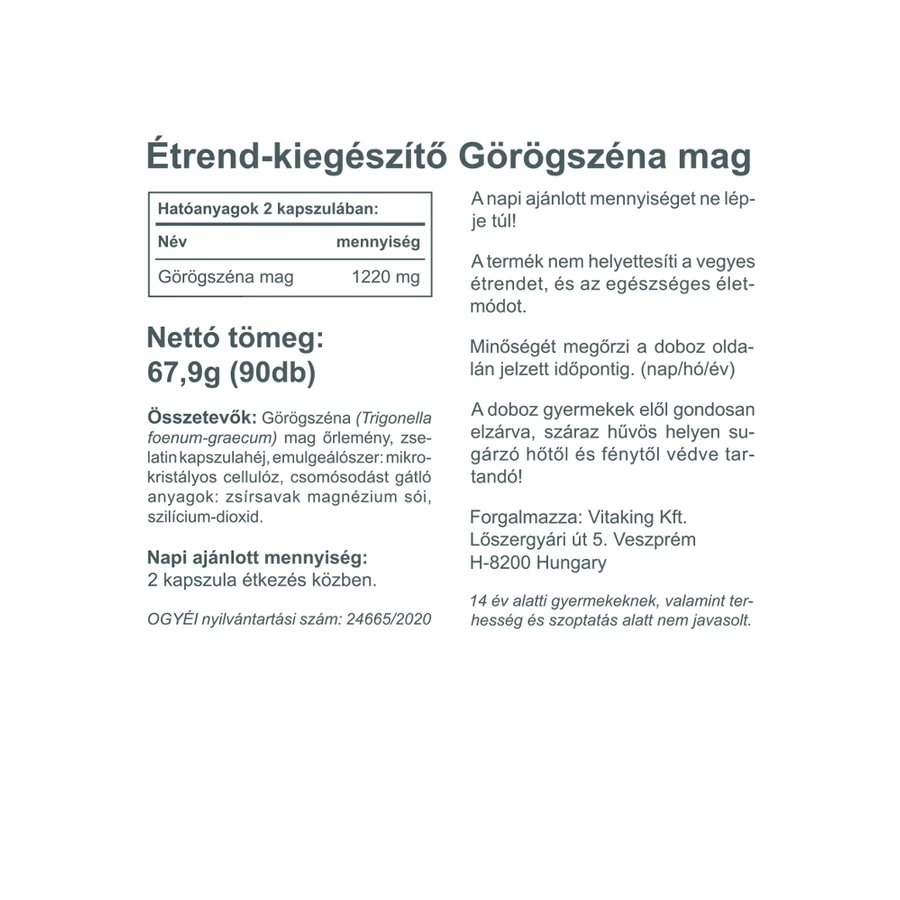 Összetevők: Görögszéna (Trigonella foenum-graecum) mag őrlemény, zselatin kapszulahéj, emulgeálószer: mikrokristályos cellulóz, csomósodást gátló anyagok: zsírsavak magnézium sói, szilícium-dioxid.
