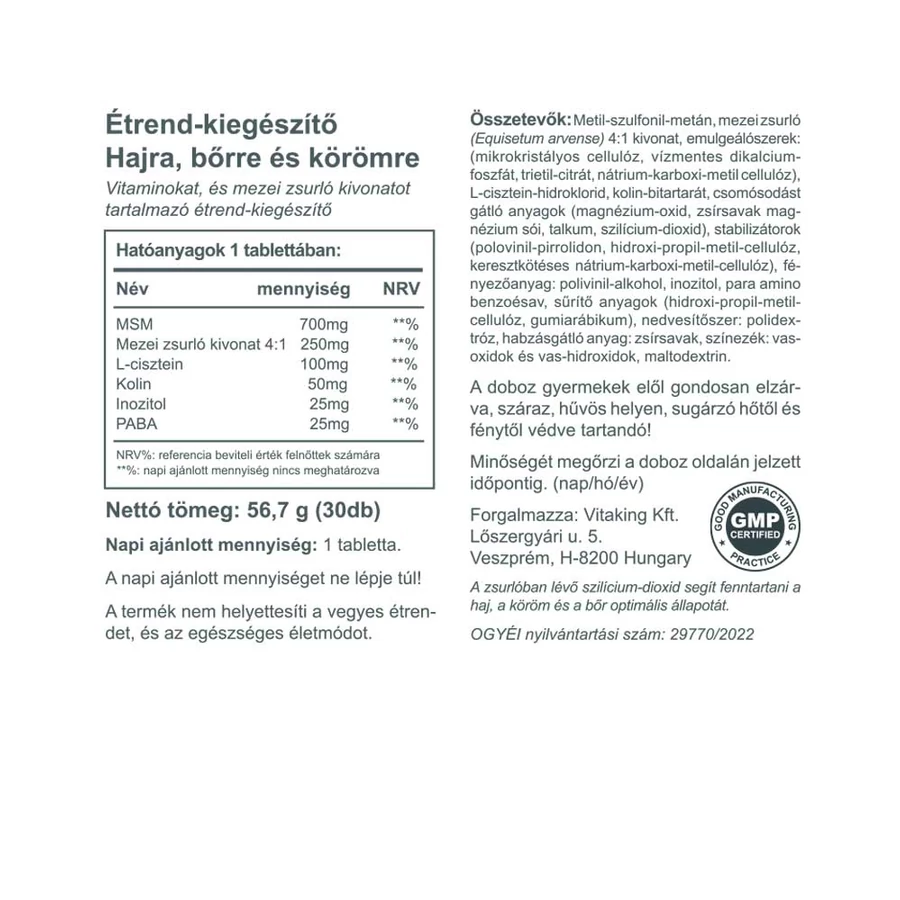 Tartalmaz többek között B-10 vitamint, vagy más néven Paba-t, kolint, inozitolt, l-cysteint, mezei zsurlót és MSM-et is.