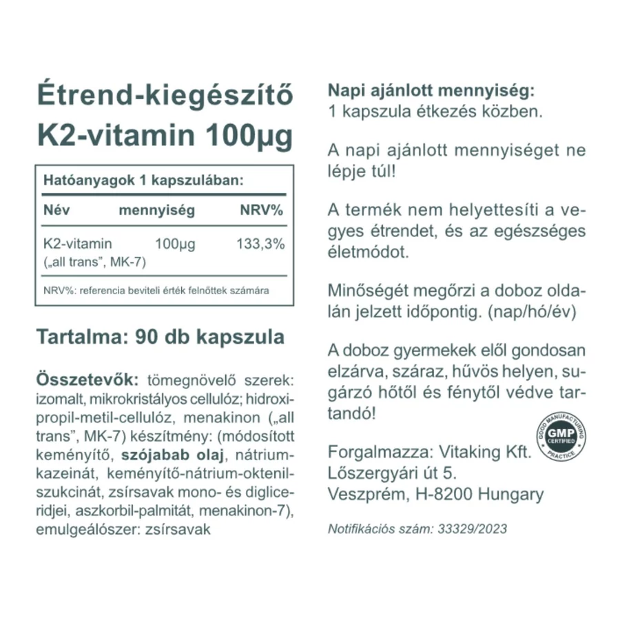 A Vitaking K2 vitamin 100µg MK7 vitamint tartalmaz.