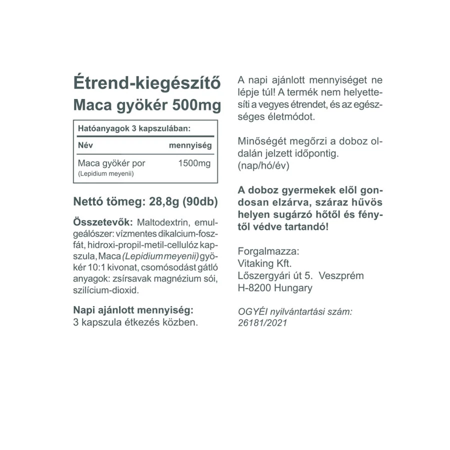 Összetevők: Maltodextrin, emulgeálószer: vízmentes dikalcium-foszfát, hidroxi-propil-metil-cellulóz kapszula, Maca (Lepidium meyenii) gyökér 10:1 kivonat, csomósodást gátló anyagok: zsírsavak magnézium sói, szilícium-dioxid.