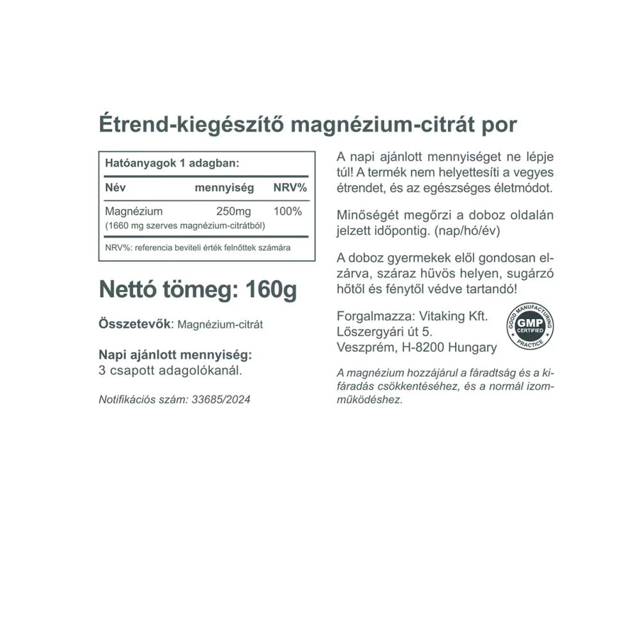 Kevés ember van tudatában annak, hogy mennyire fontos ez az ásványi anyag. Az oxigén, a víz és a fő tápanyagok (zsír, protein, szénhidrátok) után, a magnézium a talán egyik legfontosabb építőelem, amire a szervezetnek szüksége van. A Vitaking magnézium citrát por 160g magnézium citrátot tartalmaz.