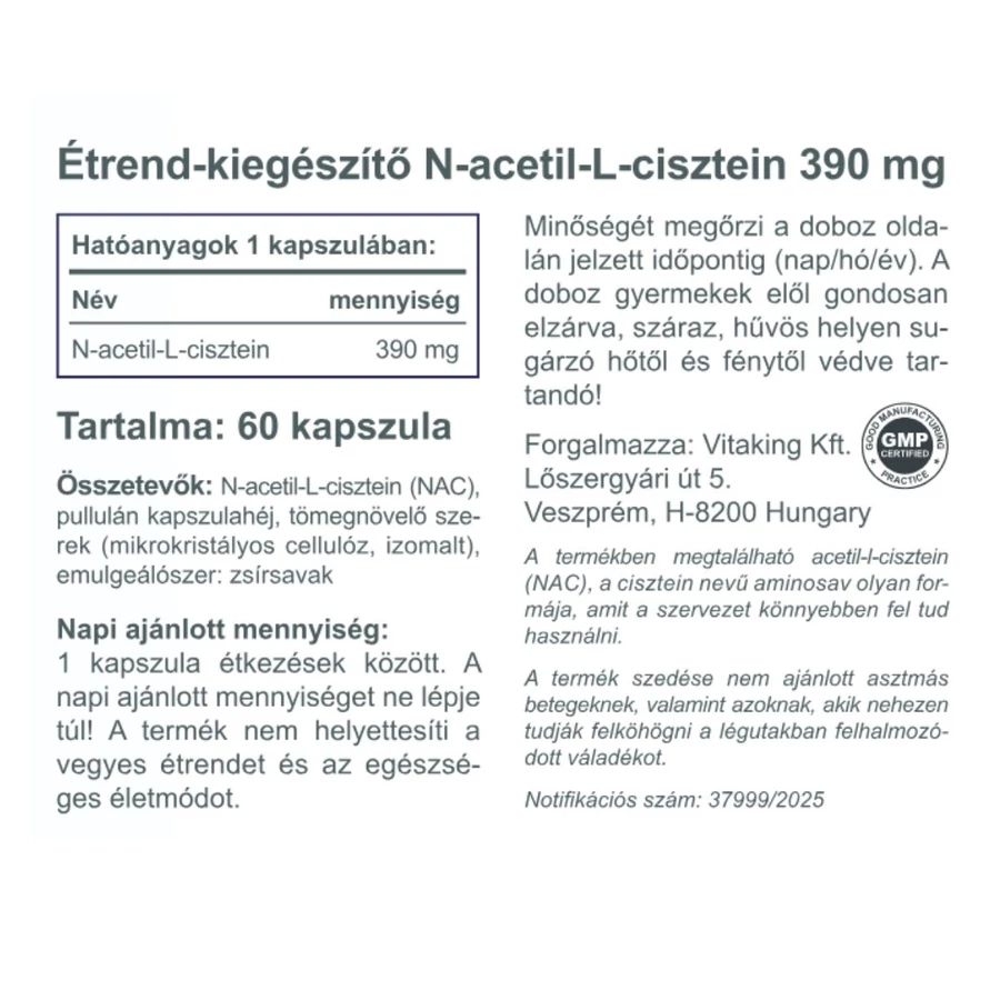 Vitaking N-acetil-L-cisztein (NAC) kapszulánként 390 mg hatóanyagtartalommal. A termék 100%-ban vegán, növényi kapszulahéjjal, és GMP-minősített üzemben készül, szigorú gyártási szabályozás mellett.