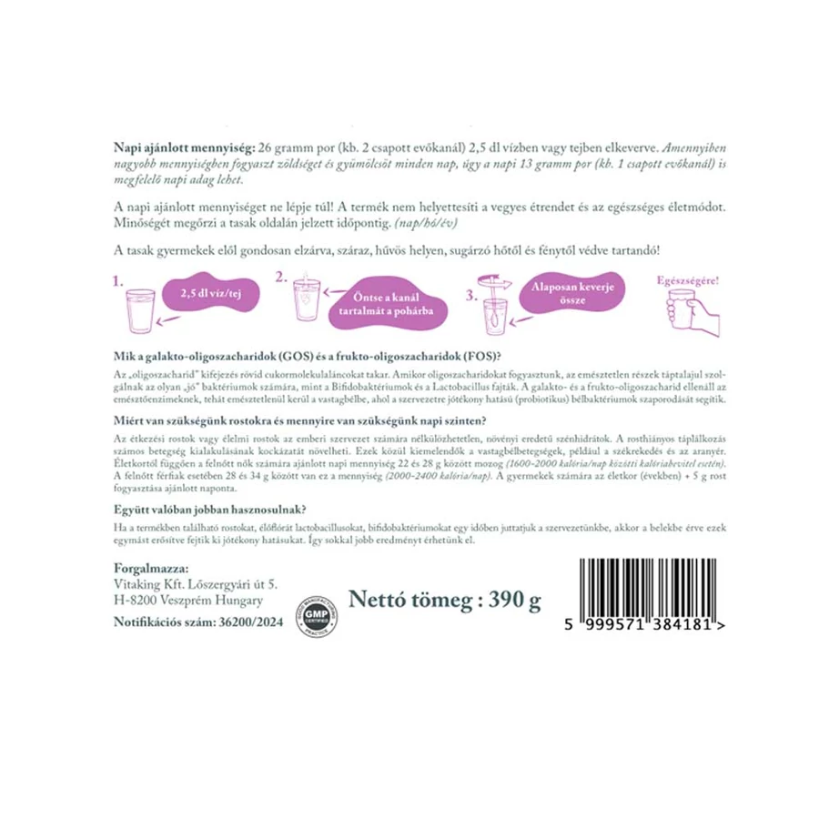 A Vitaking Symbiotic egy innovatív élőflórás és rostokban gazdag étrend-kiegészítő italpor. Finom eper ízesítéssel biztosítja a szervezet számára hasznos élő baktériumkultúrákat és prebiotikus rostokat. Az összetevők kiváló minőségét a Biotis® Fermentisből származó galakto-oligoszacharidok (GOS) és inulinból származó frukto-oligoszacharidok (FOS) garantálják, amelyek támogatják a bélflóra egyensúlyát azáltal, hogy táplálékul szolgálnak a jótékony baktériumok számára.