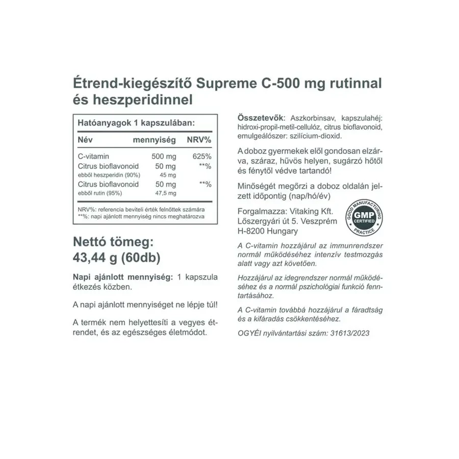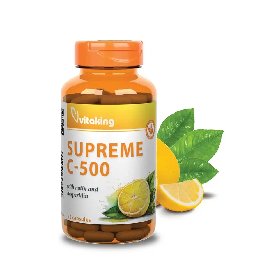 A Vitaking Supreme C-500 egy válogatott összetételű készítmény, mely kiváló minőségű alapanyagokból készült, és magas mennyiségű citrus bioflavonoiddal lett gazdagítva. Minden kapszulában 500 mg C-vitamint találsz, továbbá 100 mg citrus bioflavonoidot, melyből 45 mg heszperidin és 47,5 mg rutin.