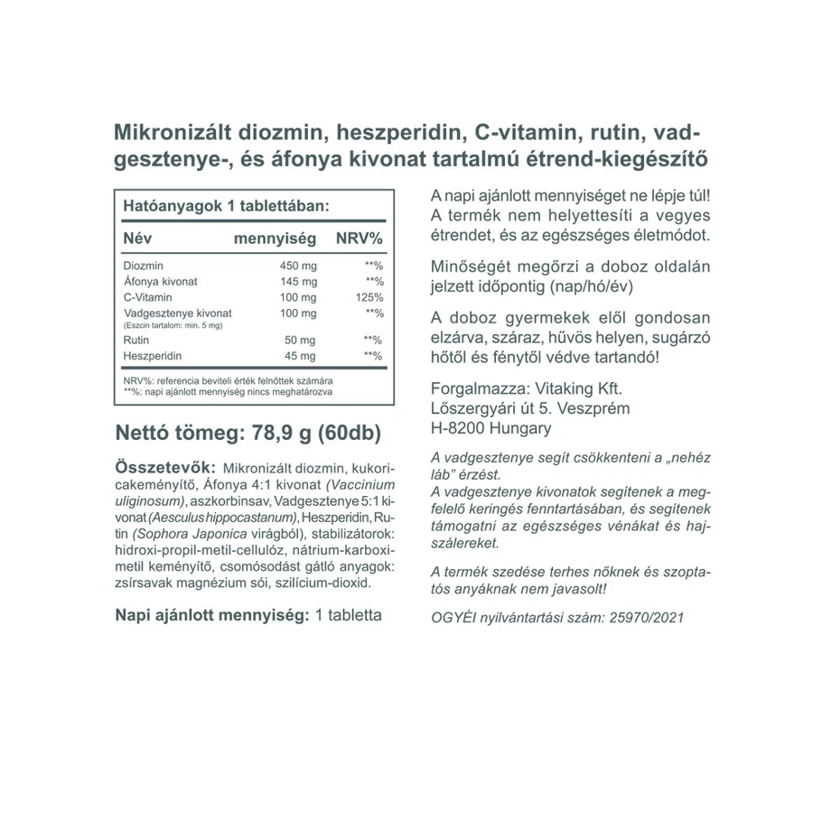 A Vitaking Vadgesztenye komplex áfonya kivonatot, diozmint, C-vitamint, vadgesztenye kivonatot és heszperidint tartalmazó készítmény. A vadgesztenye segít a „nehéz láb” érzésének csökkentésében. A vadgesztenye kivonatok segítenek a megfelelő keringés fenntartásában, és segítenek támogatni az egészséges vénákat és hajszálereket.