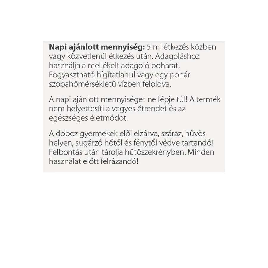 5 ml étkezés közben vagy közvetlenül étkezés után. Adagoláshoz használja a mellékelt adagoló poharat. Fogyasztható hígítatlanul vagy egy pohár szobahőmérsékletű vízben feloldva.