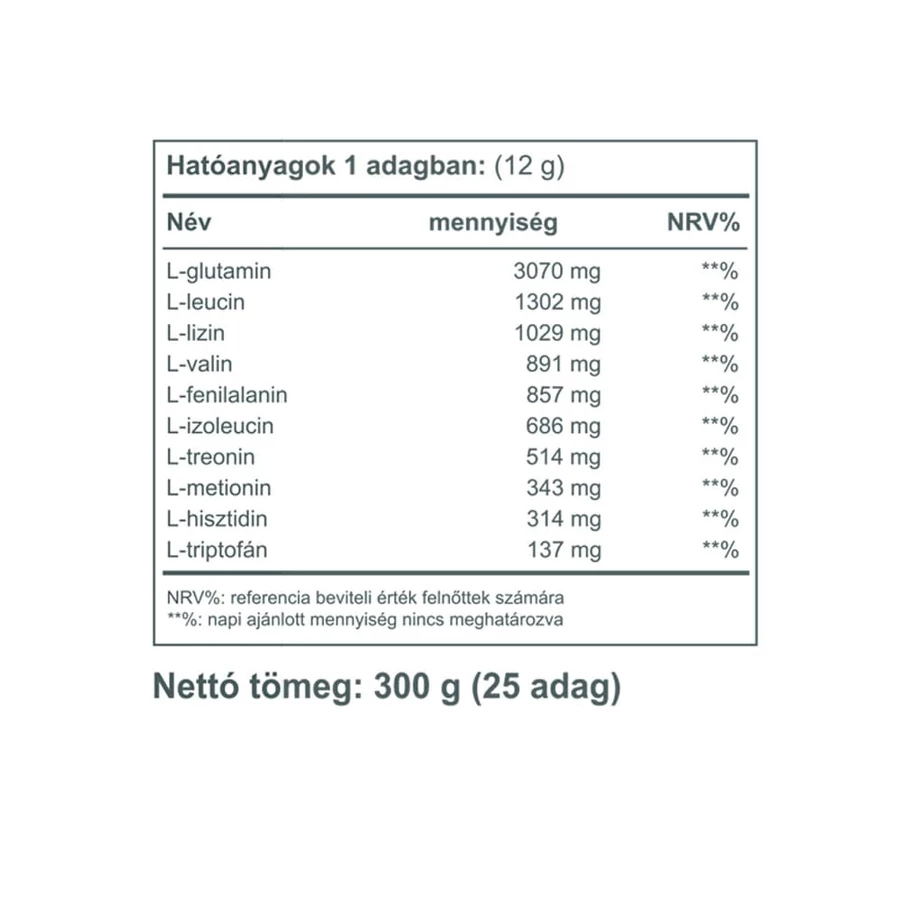 L-glutamin, Instant L-leucin:(L-leucin, emulgeálószer: Lecitinek; maltodextrin), L-lizin-hidroklorid, étkezési sav: citromsav, Aromák, L-valin, L-fenilalanin, L-izoleucin, L-treonin, L-metionin, L-hisztidin-hidroklorid, és L-triptofán, édesítőszer: szukralóz.