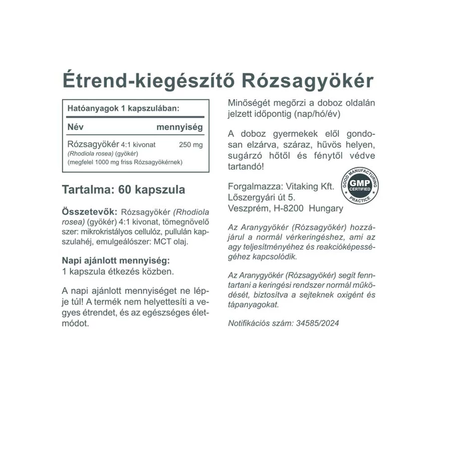 Összetevők: Rózsagyökér (Rhodiola rosea) (gyökér) 4:1 kivonat, tömegnövelő szer: mikrokristályos cellulóz, pullulán kapszulahéj, emulgeálószer: MCT olaj