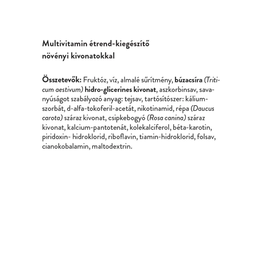 Vitemiy multivitamin összetevők: Fruktóz, víz, almalé sűrítmény, búzacsíra (Triticum aestivum) hidro-glicerines kivonat, aszkorbinsav, savanyúságot szabályozó anyag: tejsav, tartósítószer: káliumszorbát, d-alfa-tokoferil-acetát, nikotinamid, répa (Daucus carota) száraz kivonat, csipkebogyó (Rosa canina) szárazkivonat, kalcium-pantotenát, kolekalciferol, béta-karotin, piridoxin- hidroklorid, riboflavin, tiamin-hidroklorid, folsav, cianokobalamin, maltodextrin.